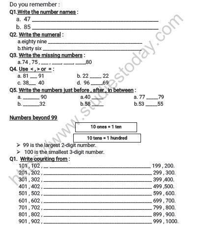 CBSE Class 2 Maths Numbers Upto 999 WorksheetMaths Worksheet For Class 2